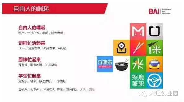 再接下来是我特别看重的一个趋势,就是“自由人的崛起”。去年到现在,大部分服务平台都开始使用各种各样的外包人员,甚至有人从周边村子里搬农民工到北京来做事。各种各样的专车让司机忙活了起来,只要你自己有车,就可以开黑车;厨师也忙起来了,如果你是做饭达人,可以在这些平台上靠手艺赚钱;学生也忙起来了,他们可以帮助分期乐这样的平台发贷,为了还贷还可以去宅米打工做兼职;如果你有一套房子,可以通过小猪短租把空屋租出去……在自由人崛起的时代,每个人都可以有一个自己的生活方式,每个人都可以是一个freelancer。我在想,如果有一天,每个人都不工作了,需要挣钱的时候,我们就把这些平台拼凑起来,“搭建”自己的生活。