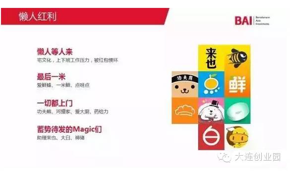 第二个趋势是懒人红利。现在,每个人都变得非常懒,我们正在享受“懒人的红利”。去年到现在大部分出现的O2O项目都在强调“上门”,什么东西都可以送上门、什么东西都可以解决“最后一米”的问题送达到你手上、什么样的人都可以为你服务。所以我们看到了爱鲜蜂、一米鲜,以及各种各样的上门服务——美甲、按摩、送药。还有从美国风靡过来的Magic私人助手们,只要你一个短信、一条微信,就有人为你服务,you can ask anything。
