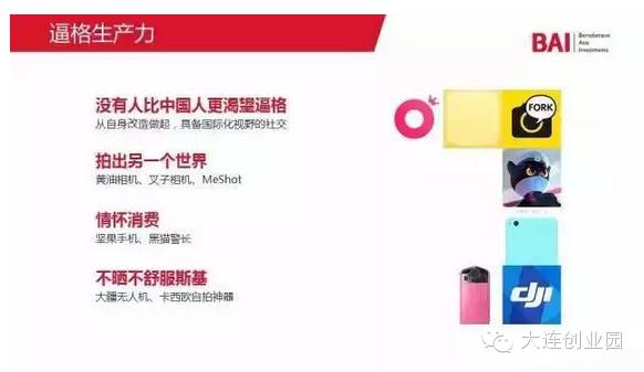 最后是“逼格生产力”。这个时代,我们都有权利秀出自己最牛逼的地方。从自身改造做起,产生一些具有国际化视野的社交能力,是很多人希望拥有的,所以也诞生了非常多相关的社交工具。比如能帮你拍出另一个世界的黄油相机,标榜情怀消费的坚果手机,六七千块钱只飞两三次目的却是秀航拍照片的大疆无人机……由此可见,逼格也是一种生产力。