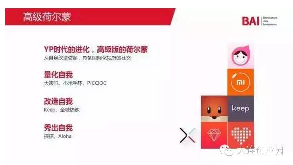 “约炮”已经是一个非常俗的词了,所以我们提出了一个“高级荷尔蒙”的概念。这个时代,有很多人从改造自身做起。量化自我,我们可以用大姨吗、小米手环、PICOOC;想来改造自己,可以用Keep来锻炼;当然,如果要秀出自我,结交一些异性和同性,还有探探和Aloha。