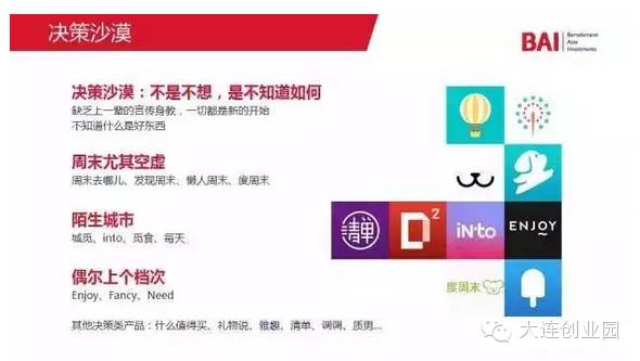 第三个趋势:决策沙漠。我个人最看重的就是中国人的“决策沙漠”。其实我们的父辈从来没有教过我们该怎么活:他们生活在一个工作的年代,因为要养育家庭和小孩,他们的生活方式就是工作。不像美国和欧洲的小孩,他们眼看着自己的父母有什么样的生活,这种生活方式就可以延续下去。但是对于我们来说就是一种全新生活方式的探索。有的人到现在也不知道他所在的城市到底有什么好玩的;想向上提高一个档次,都不知道该怎么点一份牛排。