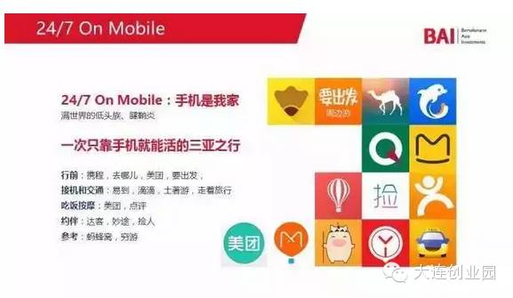 接下来是“24/7 On Mobile”现象。显然,现在的很多人都是低头族,甚至都患上了腱鞘炎,而且越来越多的事情在手机上就可以完成。我自己就曾经体验过一次完全不靠现金的旅行:只需要用PPT里这些公司的产品就可以完全解决整个旅程。到达后还可以在美团上找团购,因为目的地几乎所有的酒店、SPA都在线上了。订机票、订酒店就更不用说了,直接用这些OTA就可以;整个行程的规划我用的是蚂蜂窝和穷游;甚至如果我需要当地找个人来告诉我这个地方怎么玩,还有这么多“约伴”的平台。所以,“24/7 On Mobile”,你只需要有一台手机、一些APP以及准备好钱就行了。