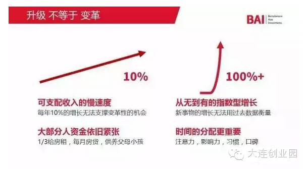 我一直认为,“消费升级”不是这个时代风险投资或者期待高增长创业机会的人应该有的理念,因为它只代表了每年10%的增长,只代表了从兰州拉面到味千拉面的过程。在这个过程当中,只能诞生一些不错的消费者企业,和互联网的关系并不是那么大。而且,大部分人的资金依旧紧张,他们三分之一的钱要交给房贷,要养父母和小孩。所以,颠覆性的机会并不能完全诞生在这10%的年增长上。我们希望看到更多从无到有的指数型的增长,从零到一的新东西出现。这些东西会直接影响到人们时间的分配,影响到他们的注意力,甚至产生习惯和口碑——这也许才是革命性机会的所在。