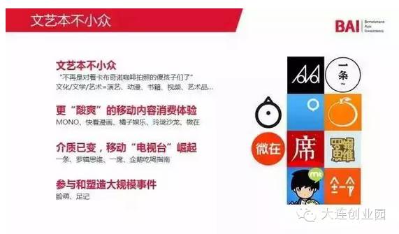 文艺已经跳脱出来,它由文化、文学和艺术组成,这三部分分别代表了一个非常大的市场。比如,现在冒出来很多更“酸爽”的移动内容消费应用,有MONO、快看漫画等;也有在这样一个阅读介质变化的时代出现的各式各样的移动电视台,比如一条、一席、企鹅吃喝指南等;当然,用户有时不再只是一个内容消费者,也是一个非常成功的内容生产者,所以我们看到了脸萌和足记的出现。